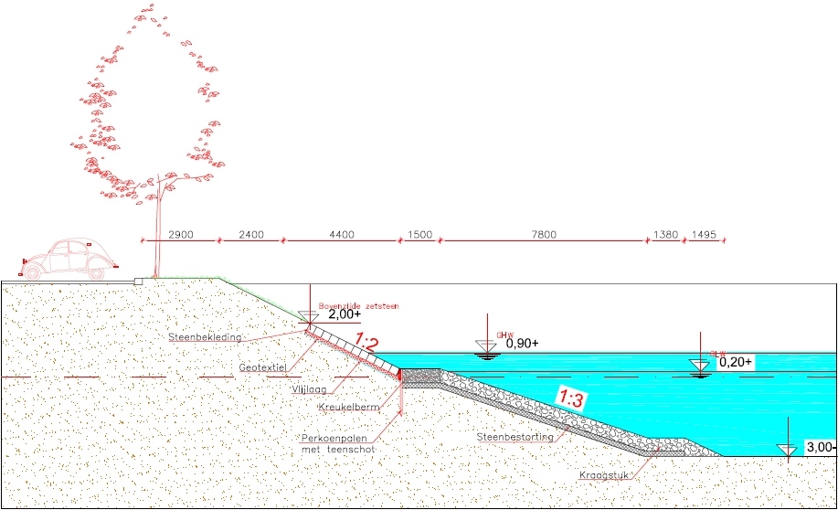 De onderwater oeverbekleding is ontworpen als een breuksteen helling. De bekleding boven water bestaat uit een combinatie van graniet blokken (Petit graniet) en gras.